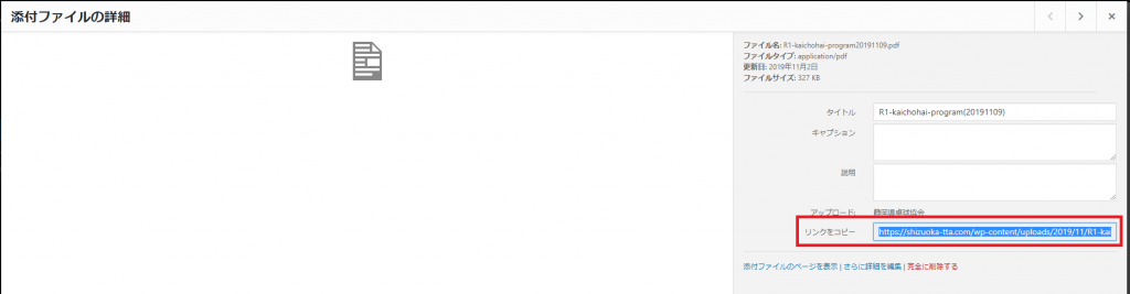 アップロードしたら,アップロードしたファイルをクリックし,ファイルの詳細を開きます。右側にファイルのリンク先が表示されるので,リンクをコピーしておきます。