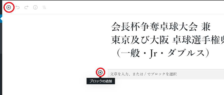 ボタンのブロックを挿入します。左上または空のブロック左側に表示されている+ボタンをクリックします。