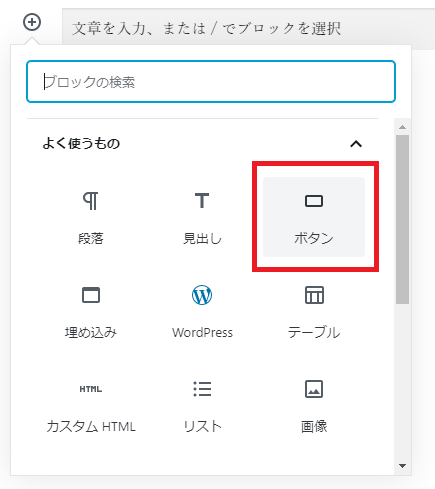 挿入するブロックはボタンなので,一覧からボタンを選択します。ボタンは使用頻度が高いので,下図ではよく使うものから選んでいます。よく使うものになければレイアウト要素にあります。